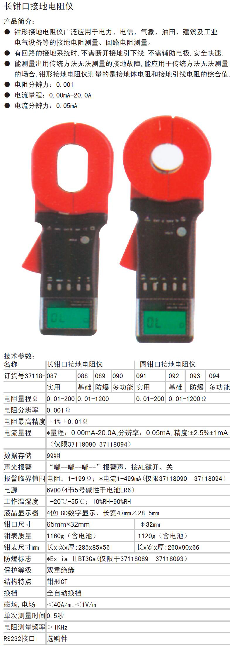 A51691 37118087 0.01-200 0.001Ω ±1%±0.01Ω - 99组 “嘟--嘟--嘟--”报警声,按AL键开、关 - 6VDC(4节5号碱性干电池LR6) (-20℃-55℃;10%RH-90%RH) 4位LCD数字显示,长宽47mm×28.5mm 65mm×32mm 1160g(含电池) 长×宽×厚:285×85×56mm *Ex ia ⅡBT3Ga(仅限于37118089 37118093) 双重绝缘 钳形CT 全自动换档 <40A/m;<1V/m 0.5秒 >1KHz 5577.00
