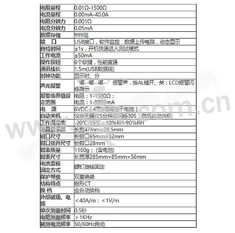·突破开机长时间自检等待,开机快速进入测试·突破继电器自检方式,采用先进的算法及数字集成处理技术·增加实时时钟功能,显示当前测试的实时时间·全新外观设计,面板6键操作,性能直通·增加声光报警功能,“嘟--嘟--嘟--”报警声·增加干扰信号识别指示功能,“嘟--嘟--嘟--”声提示·增加多种显示模式组合,可选择电阻+电流、电阻+时间、电流+时间同屏显示·测量范围更大:0.01Ω-1500Ω、0.00mA-40.0A·存储数据99