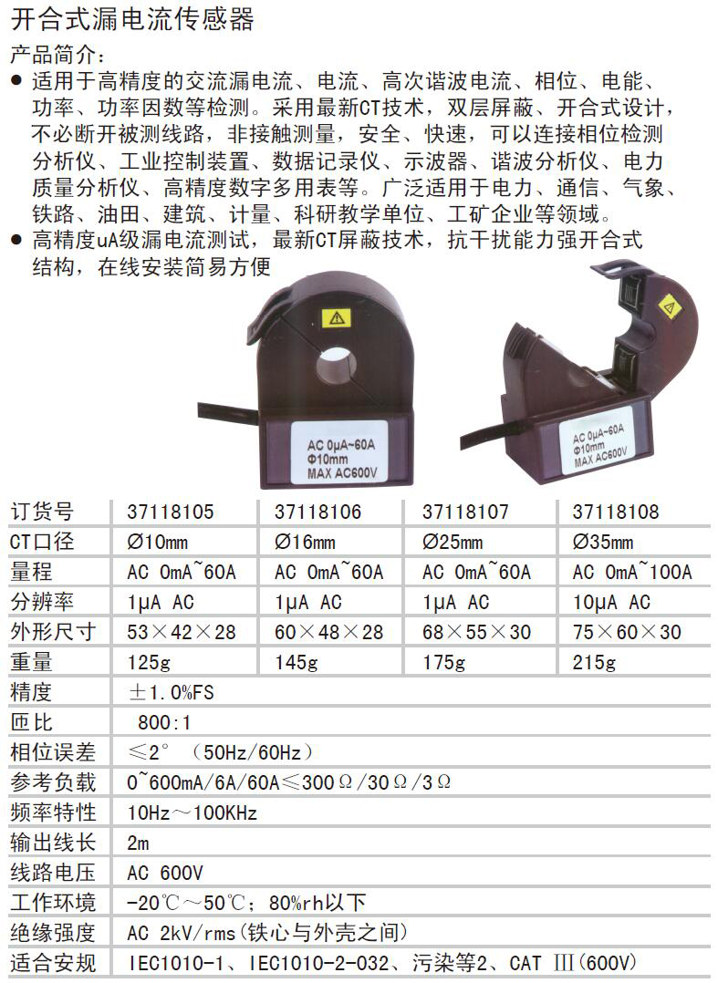 A51745 37118105 ?10mm AC0mA~60A 1μAAC 53×42×28mm 125g ±1.0%FS 800:01:00 ≤2°(50Hz/60Hz) 0~600mA/6A/60A≤300Ω/30Ω/3Ω 10Hz~100KHz 2m AC 600V -20℃~50℃;80%rh以下 AC 2kV/rms(铁心与外壳之间) IEC1010-1、IEC1010-2-032、污染等2、CAT Ⅲ(600V) 370.50