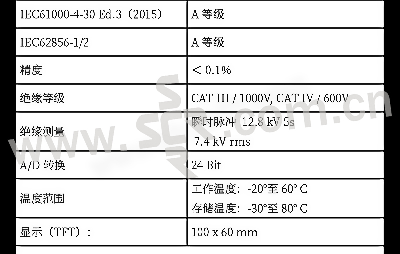 ·具有IEC61000-4-30A类仪器证书,2-50次谐波,2-9khz高频谐波测试,实时采样率40.96KHz,FFT傅里叶分析至20KHz,故障录波,模拟量输入接口,电压质量及偏差测试,频率偏差测试,三相不平衡测试,功率测试,闪变测试,远程控制,依据标准自动一键国标报告报表,免费全中文分析软件,IP65防护等级