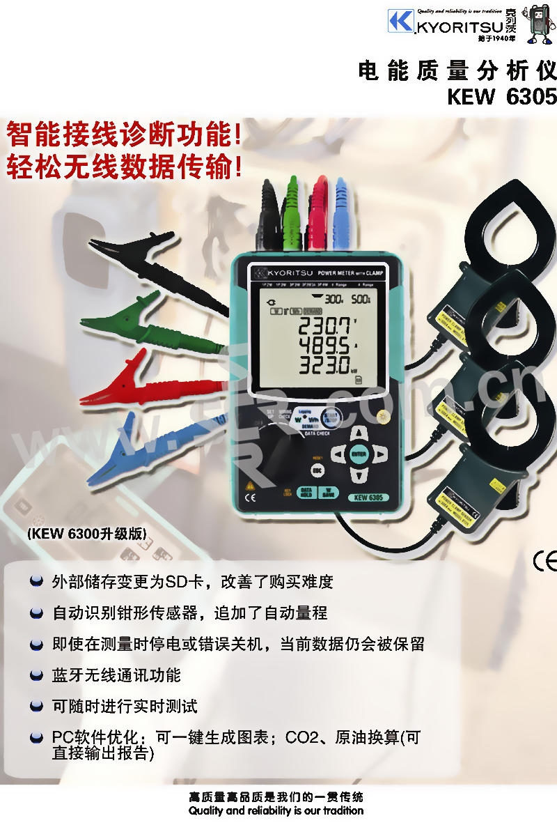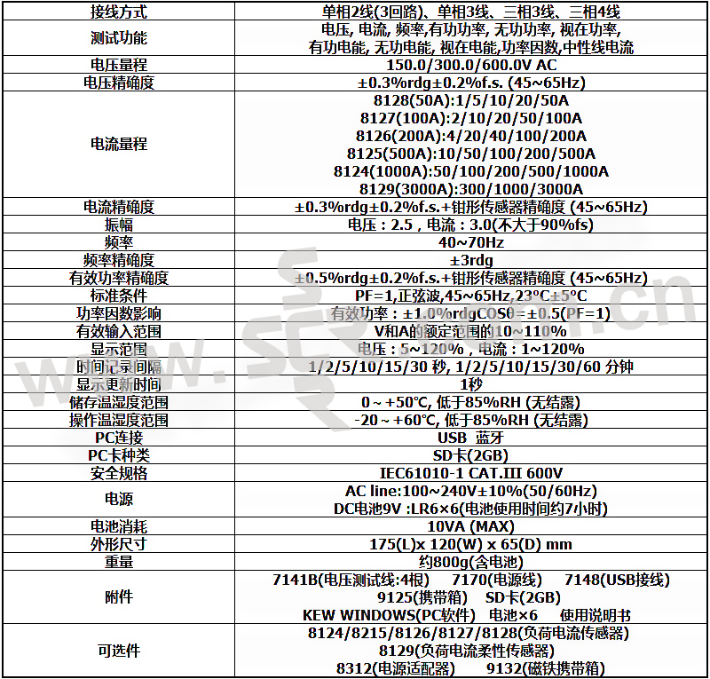 ·自动识别钳形传感器,增加了自动量程。 ·即使在测量时停电或错误关机,当前数据仍会被保留。 ·蓝牙无线通讯功能。 ·可随时进行实时测试。 ·PC软件优化:可一键生成图表;CO2、原油换算(可直接输出报告)。 ·12种电力测试:电压(RMS),电流(RMS),有功功率,无功功率,视在功率,有功电能,无功电能,视在电能,功率因数(COSθ),频率,需求测试,中性电流(仅三相4线)。 ·可测试再生电力:消耗电力和再生电力的检测。 ·可确认各相