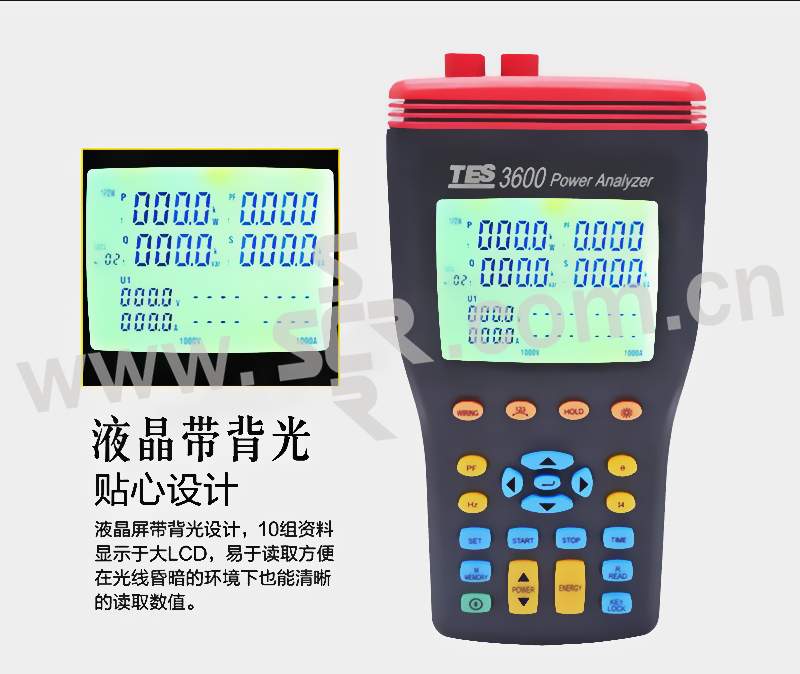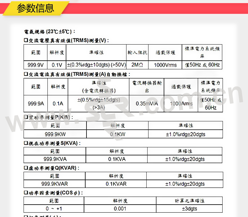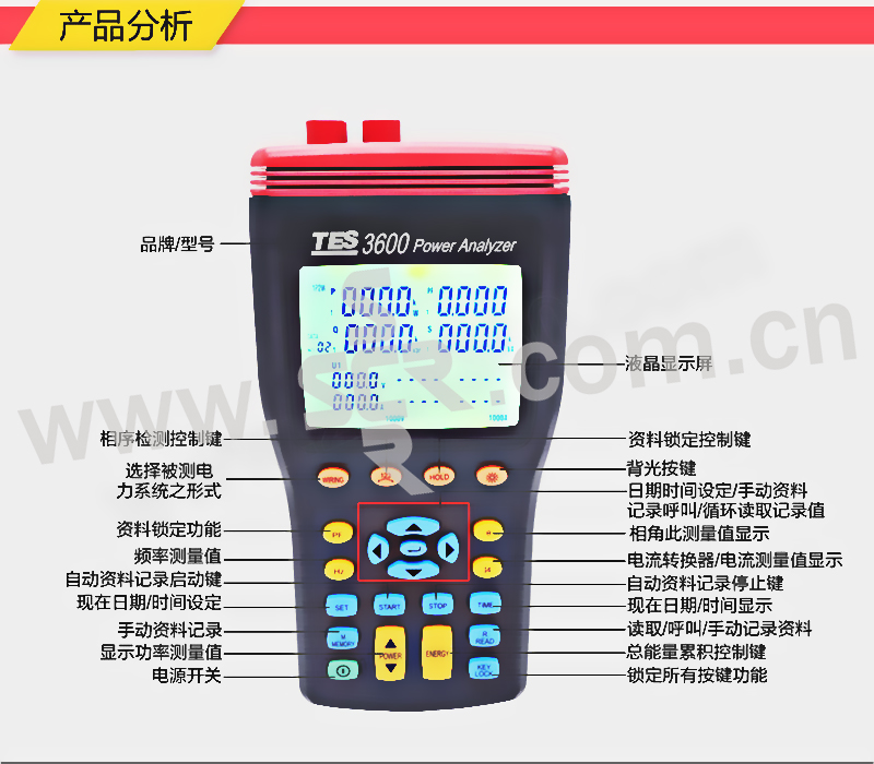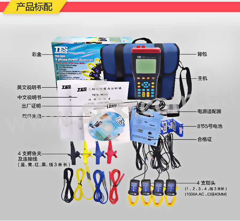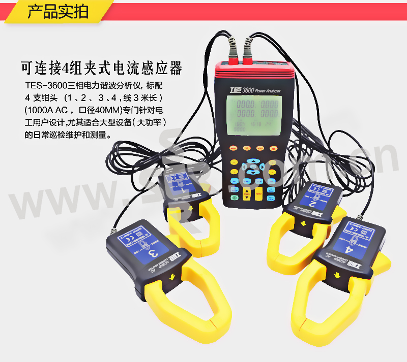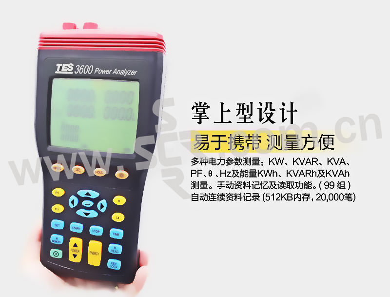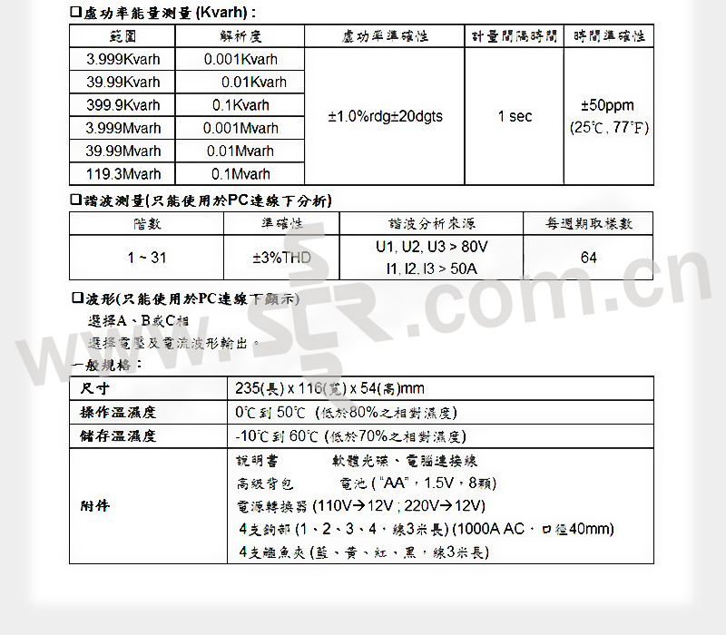 ·10组数据显示于大LCD,易于读取。·可连接4组夹式电流感应器。·1P2W、1P3W、3P3W2M、及3P4W式功率测量。·真有效值测量。·电力KW、KVAR、KVA、PF、θ、Hz及能量KWh、KVARh及KVAh测量。·相序指示功能。·背光显示功能。·手动数据记忆及读取功能。(99 组)·自动连续数据记录 (504KB内存,20,000笔)·可设定开始记录及结束记录时间。·USB光接口传输,