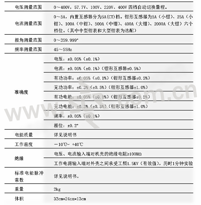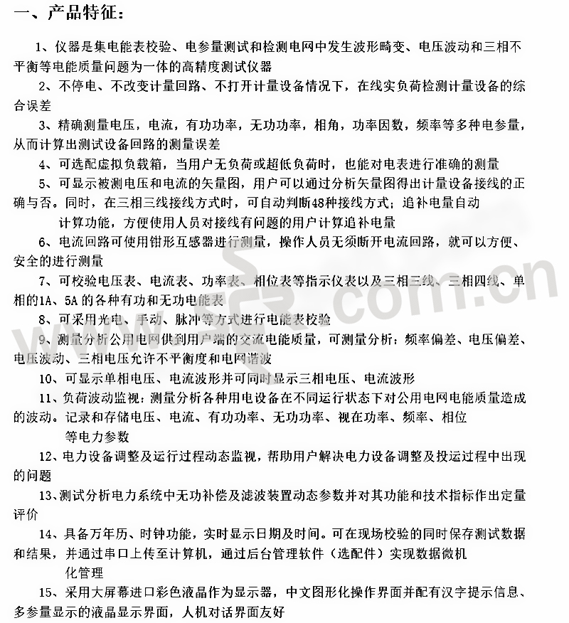 ·仪器是集电能表校验、电参量测试和检测电网中发生波形畸变、电压波动和三相不平衡等电能质量问题为一体的高精度测试仪器·不停电、不改变计量回路、不打开计量设备情况下,在线实负荷检测计量设备的综合误差·精确测量电压,电流,有功功率,无功功率,相角,功率因数,频率等多种电参量,从而计算出测试设备回路的测量误差·可选配虚拟负载箱,当用户无负荷或超低负荷时,也能对电表进行准确的测量·可显示被测电压和电流的矢量图,用户可以通过分析矢量图得出计量设备接线的正确与否。同时,在三相三线