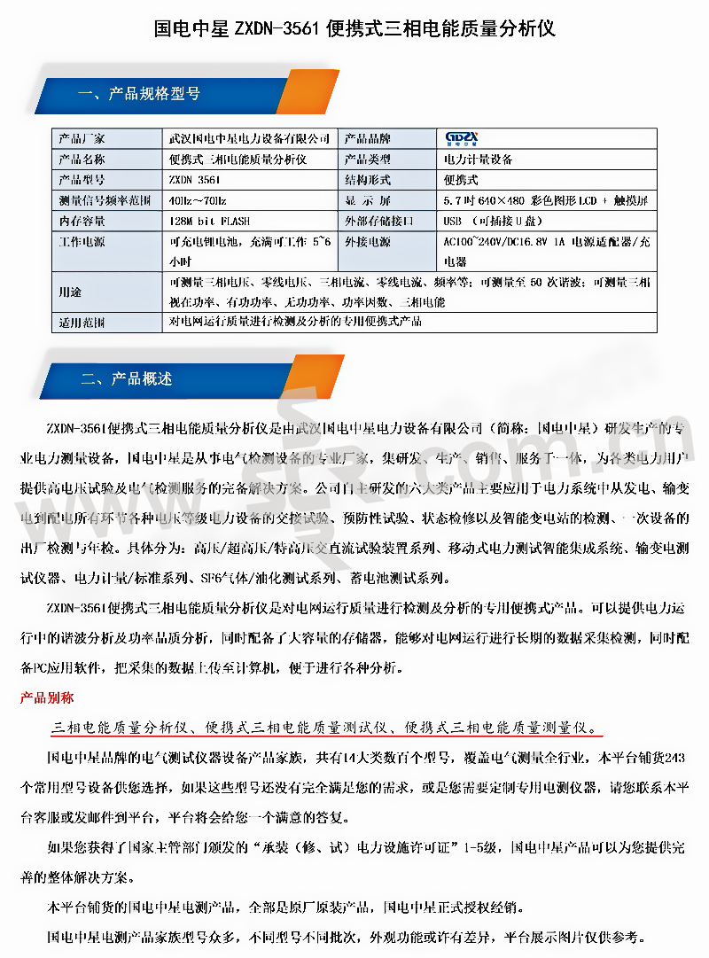 GDZX/国电中星 便携式三相电能质量分析仪 ZXDN-3561 测量交流电压电流和功率 1套