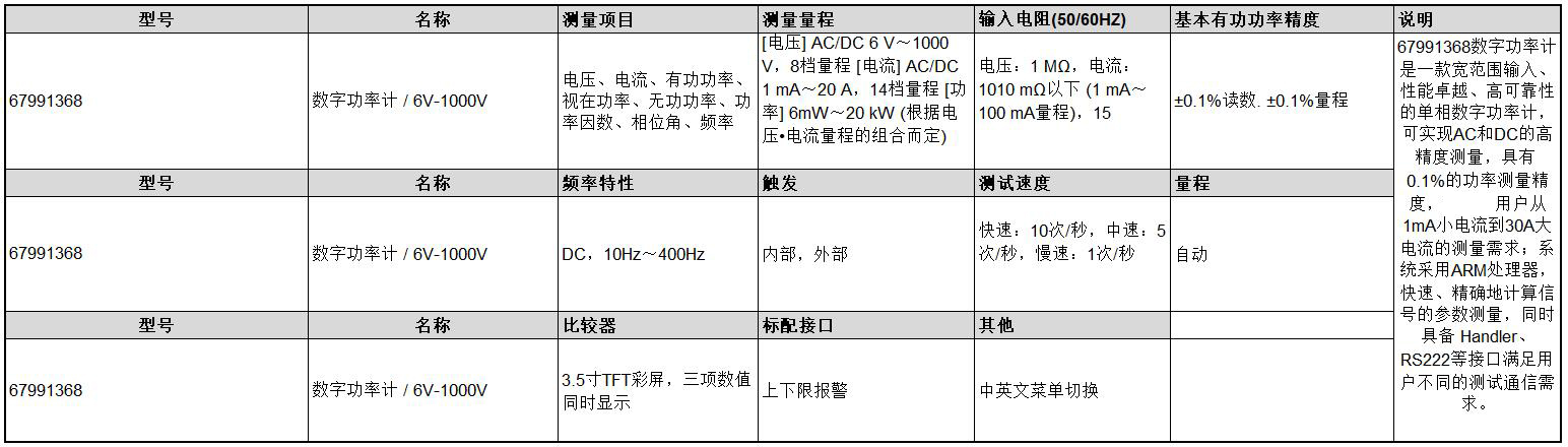 ·67991368数字功率计是一款宽范围输入、性能卓越、高可靠性的单相数字功率计,可实现AC和DC的高精度测量,具有 0.1%的功率测量精度,可满足用户从1mA小电流到30A大电流的测量需求; ·系统采用ARM处理器,快速、精确地计算信号的参数测量,同时具备 Handler、RS222等接口满足用户不同的测试通信需求。