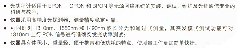·光功率计适用于EPON、GPON和BPON等无源网络系统的安装、调试、维护及光纤通信专业的科研与教学; ·仪器采用高精度光探测器,测量精度稳定可靠; ·可同时对1310nm、1550nm和1490nm波长分光和通过式测量,其突发模式测试功能可对1310nm上行PON信号进行准确突发光功率测试; ·仪器具有体积小,重量轻,便于携带和低功耗的特点,使测量工作更加简单快捷。