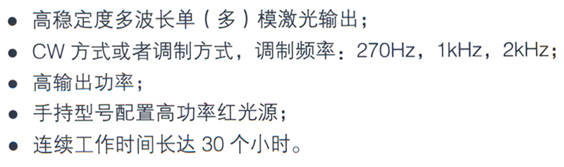 ·高稳定度多波长多模激光输出; ·cW方式或者调制方式,调制频率:270Hz,1kHz,2kHz; ·高输出功率; ·手持型号配置高功率红光源; ·连续工作时间长达30个小时。