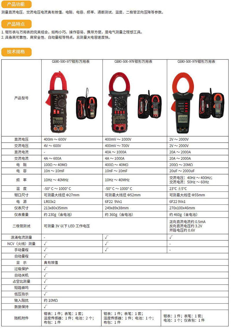 ·钳形表与万用表的完美组合,结构小巧、操作容易、携带方便,是电气测量之理想工具。 ·具备高可靠性、高安全性、自动量程等特点。且测量大电容速度快。