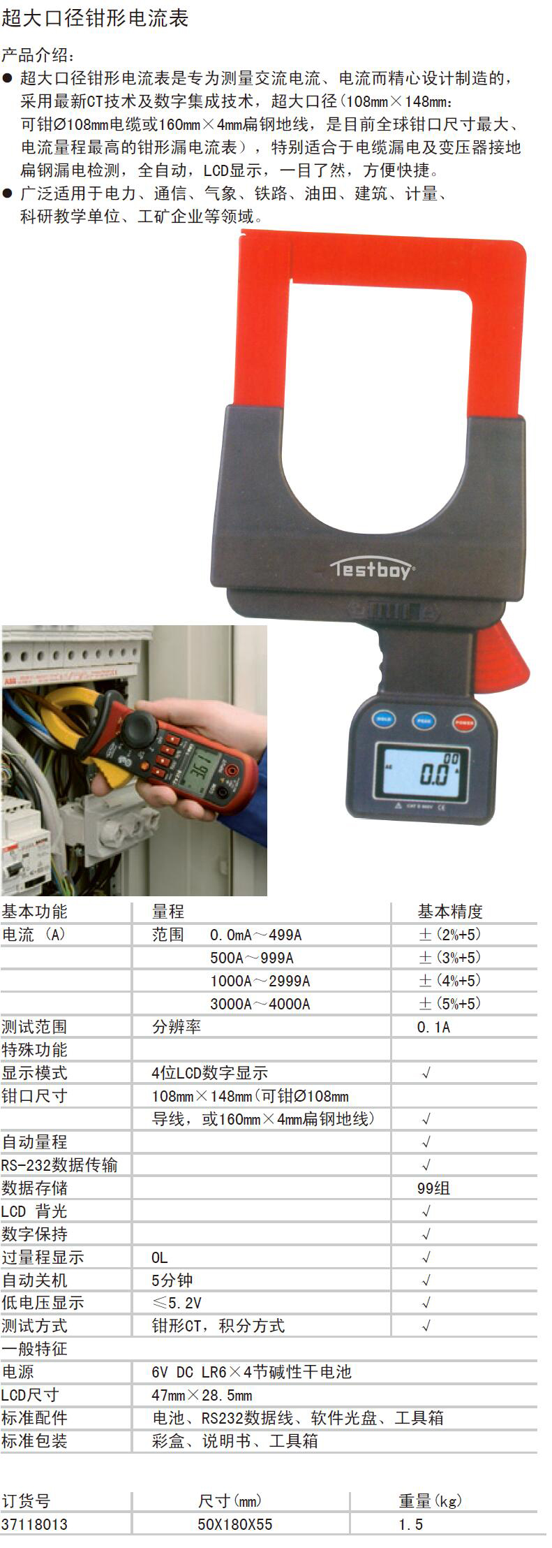 ·超大口径钳形电流表是专为测量交流电流、电流而精心设计制造的, 采用最新CT技术及数字集成技术,超大口径(108mm×148mm: 可钳Ø108mm电缆或160mm×4mm扁钢地线,是目前全球钳口尺寸最大、 电流量程最高的钳形漏电流表),特别适合于电缆漏电及变压器接地 扁钢漏电检测,全自动,LCD显示,一目了然,方便快捷。 · 广泛适用于电力、通信、气象、铁路、油田、建筑、计量、 科研教学单位、工矿企业等领域。 ·一般特征:电源:6V DC LR6×4节碱性干电池 ·LCD尺寸:47mm×28.5mm ·标准配件:电池、RS232数据线、软件光盘、工具箱 ·标准包装:彩盒、说明书、工具箱