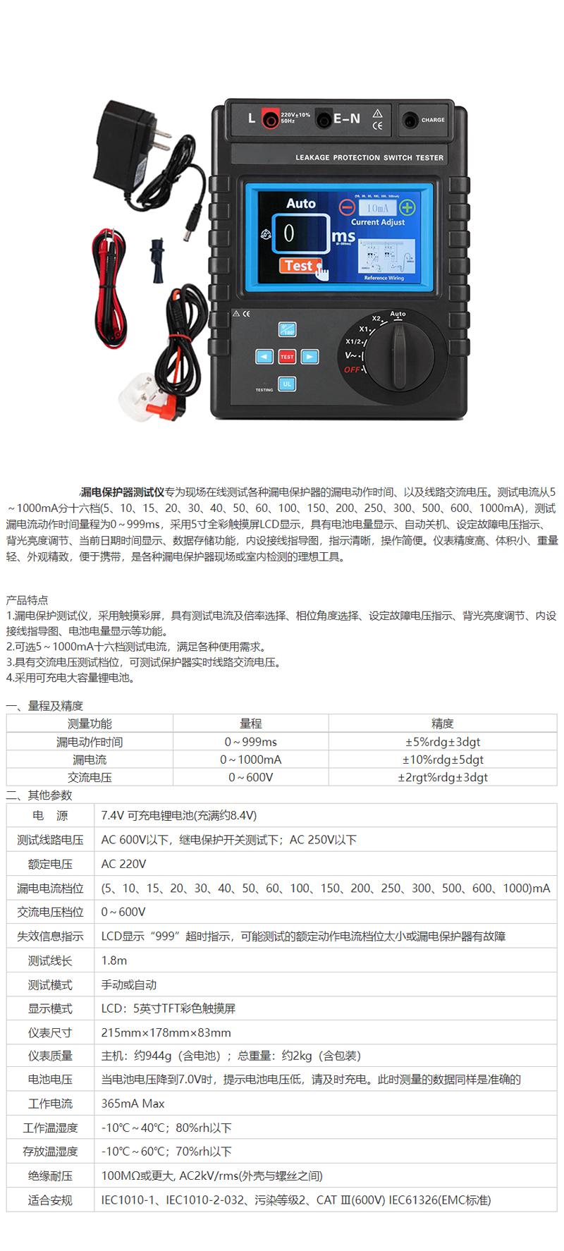 该测试仪为手持式.便于携带,测试漏电保护器的漏电时间,漏电电流