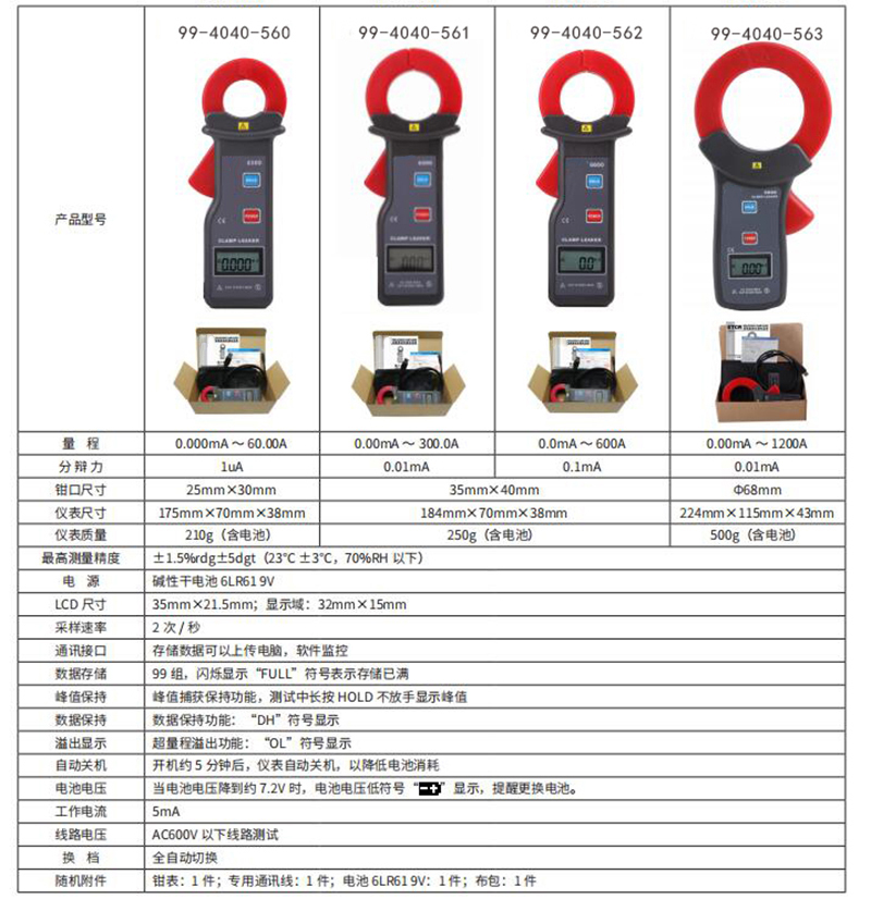 C70209 99-4040-563 0.00mA~1200A 0.01mA φ68mm 224×115×43mm 2430.00