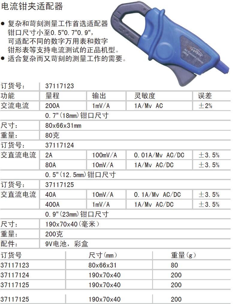 ·复杂和苛刻测量工作首选适配器 ·钳口尺寸小至0.5"0.7"0.9", ·可适配不同的数字万用表和数字 ·钳形表等支持电流测试的正品机型。 · 适合复杂而又苛刻的测量工作的需要。