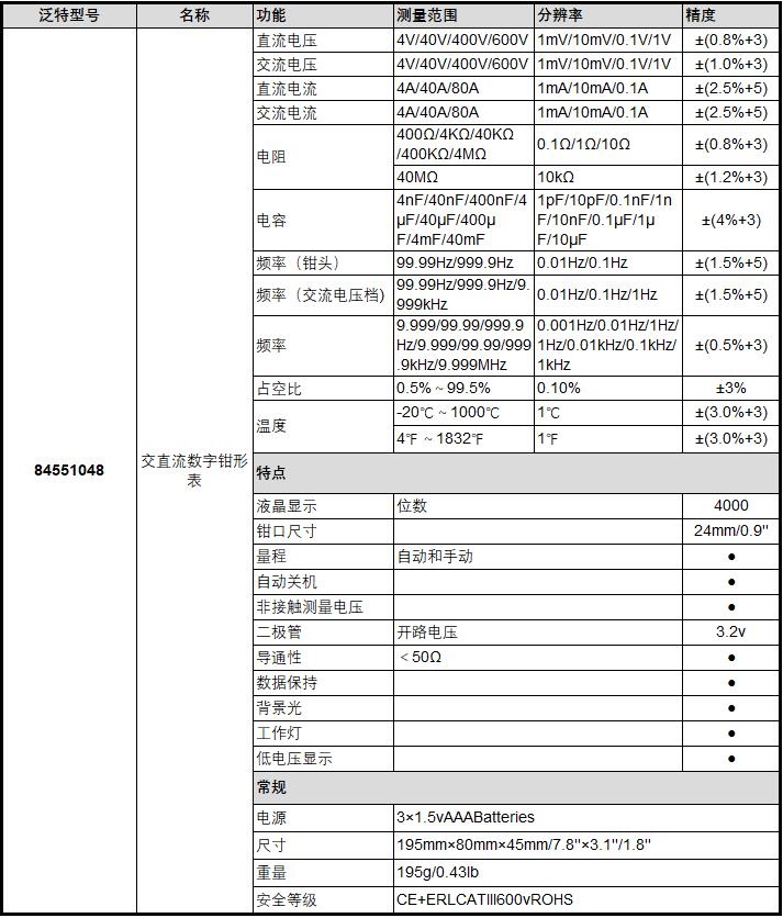 A32142 84551048 4V/40V/400V/600V 1mV/10mV/0.1V/1V 4A/40A/80A,1mA/10mA/0.1A 400Ω/4KΩ/40KΩ/400KΩ/,0.1Ω/1Ω/10Ω 0.5%~99.5% ­20℃~1000℃ 4℉~1832℉ 24mm×0.9'' <50Ω 3×1.5vAAABatteries 195mm×80mm×45mm/7.8''×3.1''/1.8'' 195g/0.43lb CE+ERLCATlll600vROHS 1532.00