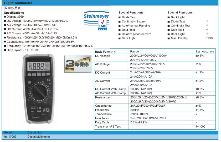 ·规格:3999号 ·直流电压:400mV/4V/40V/400V/1000V+0.7% ·交流电压:4V/40V/400V/750V10.8% ·直流电流:4000uA/400mA/10A士1.2%交流电流:-4000uA/400mA/10A士1.5% ·电阻:400Q/4kQ/40kQ/4O0kQ/4MQ/40MQ+1.2%电容:4NFL40NF400NF14UFI40uF/200uF+5% ·频率:10Hz/100Hz/1000Hz/10kHz/100kHz/1000kHz/1Hz土2% ·占空比:0.1%~99.9 直流电压:20omv/2v/2ov/2ooV/1o0ov,土0.5% 交流电压:200毫伏12oV/100ov,20omv/2v/20V/2ooVr7oov,±1% 直流电流:200mv/20v7oov,2mA/20mA/200mA10A,士1.2% 交流电流:2mA/20OmA/10A,2mA/20毫安Ar200mA10A,士1.2%