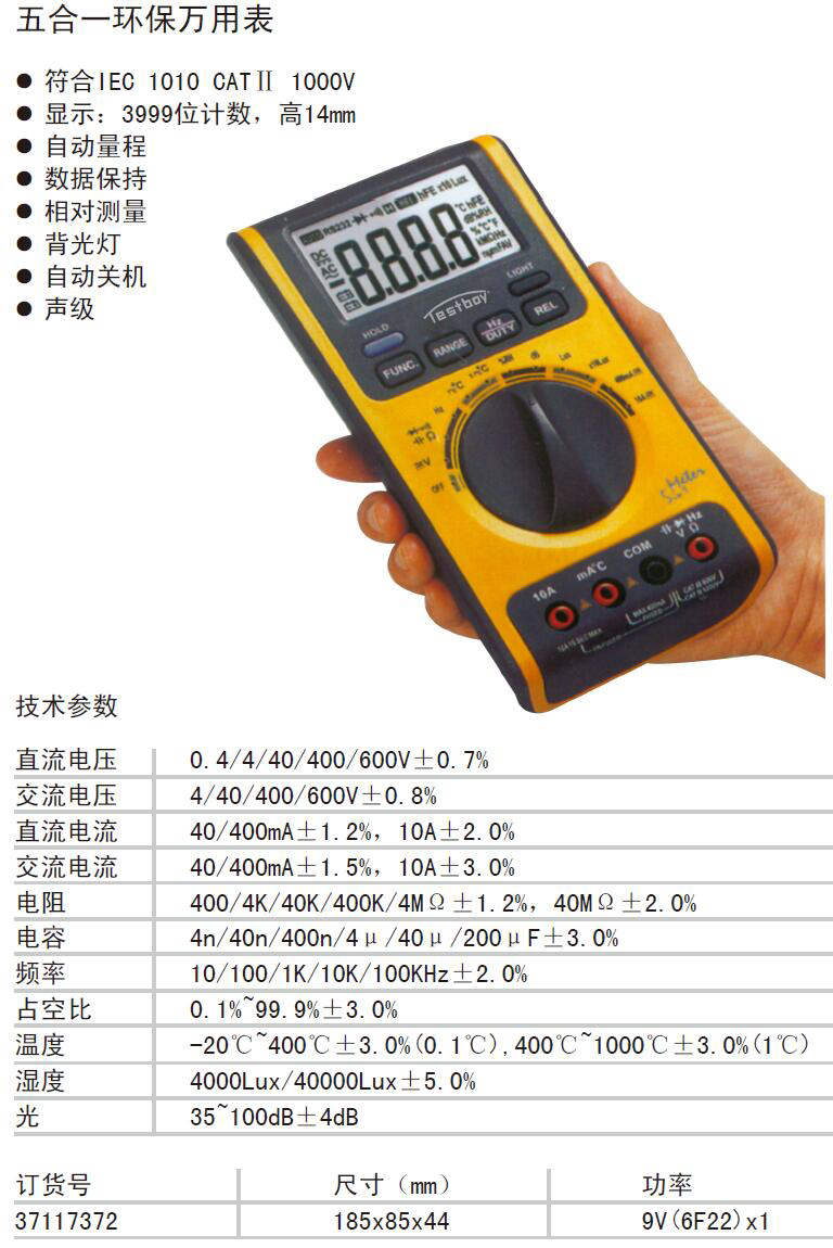 · 符合IEC 1010 CATⅡ 1000V ·显示:3999位计数,高14mm · 自动量程 ·数据保持 · 相对测量 · 背光灯 ·自动关机 · 声级