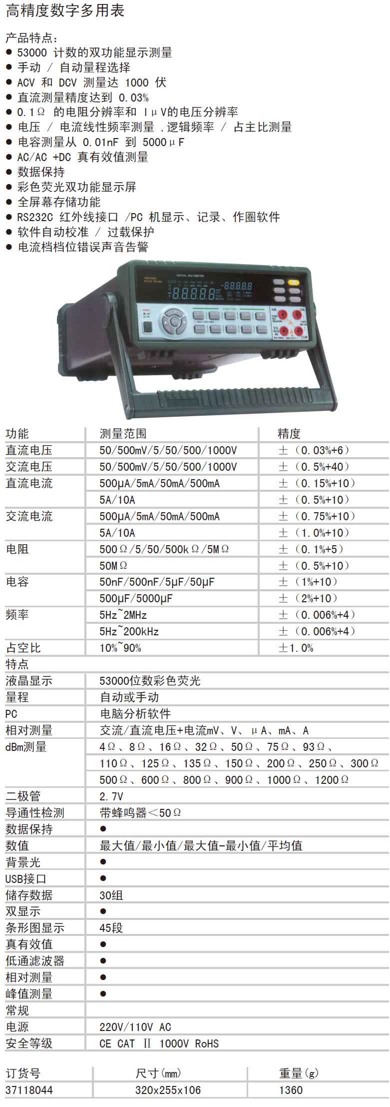 ·53000 计数的双功能显示测量 ·手动 / 自动量程选择 ·ACV 和 DCV 测量达 1000 伏 ·直流测量精度达到 0.03% ·0.1Ω 的电阻分辨率和 lμV的电压分辨率 ·电压 / 电流线性频率测量 ,逻辑频率 / 占主比测量 ·电容测量从 0.01nF 到 5000μF ·AC/AC +DC 真有效值测量 ·数据保持 ·彩色荧光双功能显示屏 ·全屏幕存储功能 ·RS232C 红外线接口 /PC 机显示、记录、作圈软件 ·软件自动校准 / 过载保护 ·电流档档位错误声音告警