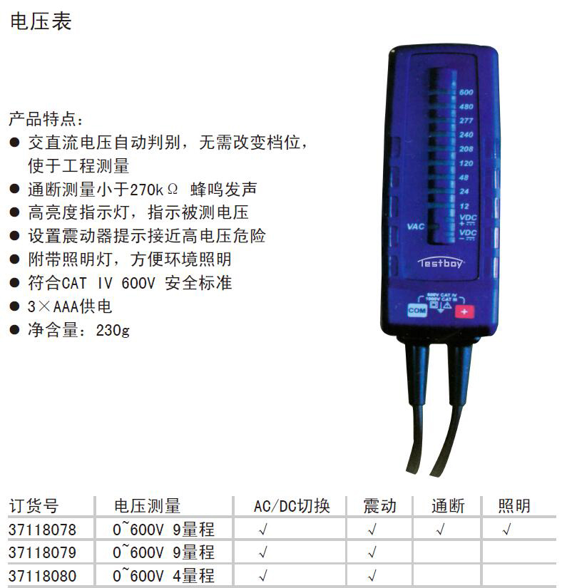 · 交直流电压自动判别,无需改变档位, 使于工程测量 ·通断测量小于270kΩ 蜂鸣发声 ·高亮度指示灯,指示被测电压 · 设置震动器提示接近高电压危险 · 附带照明灯,方便环境照明 · 符合CAT IV 600V 安全标准 · 3×AAA供电 · 净含量:230g