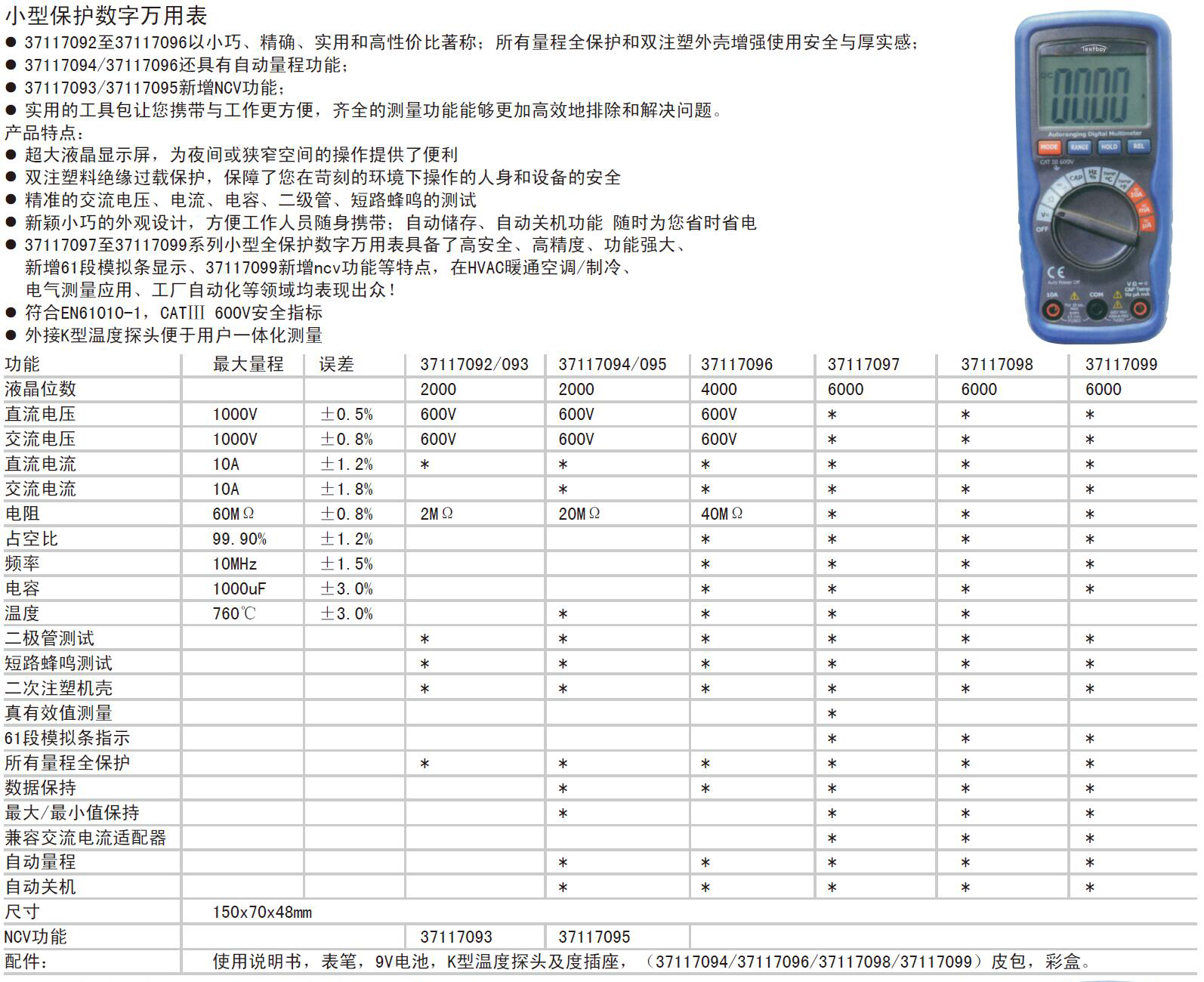 · 37117092至37117096以小巧、精确、实用和高性价比著称;所有量程全保护和双注塑外壳增强使用安全与厚实感;