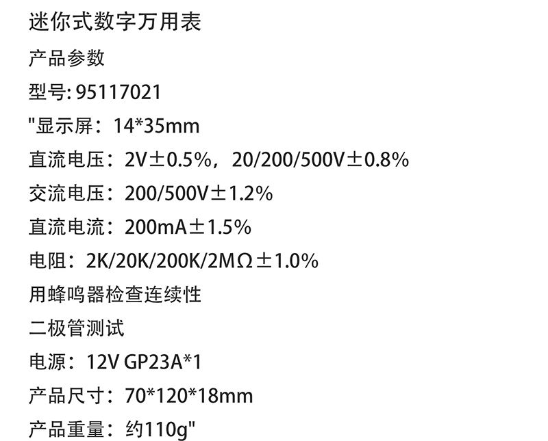 迷你式数字万用表 95117021 70×120×18mm 1台