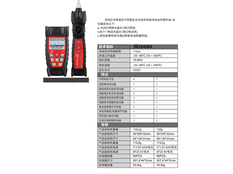 ·寻线仪可带电抗干扰能在众多线中快速寻找出所需的线,本仪器适合以下: a.RJ45(网络水晶头)接口网线;b.RJ11(电话水晶头)接口电话线; c.其他金属导线可通过鳄鱼夹适配器转接;
