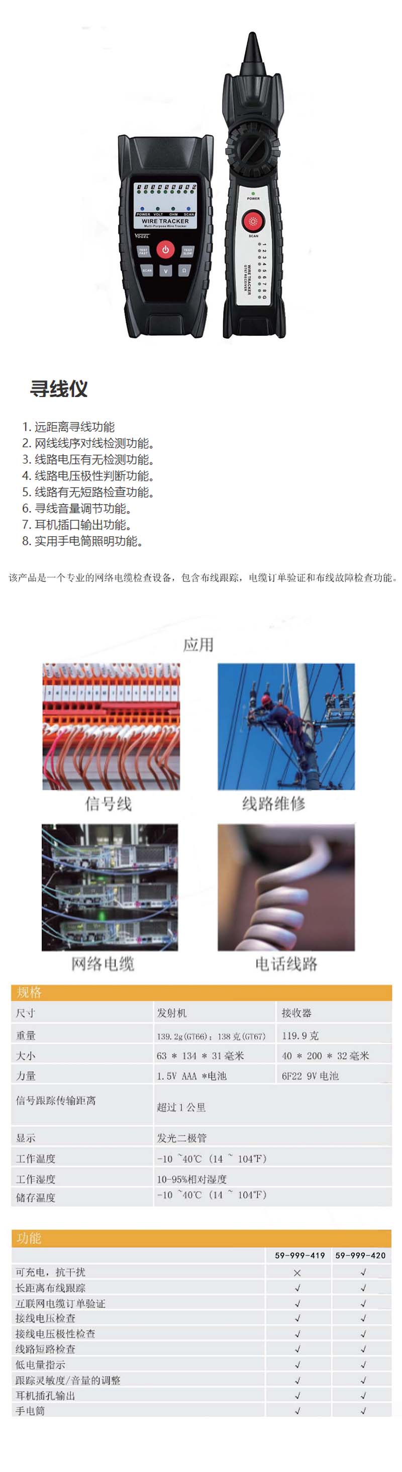 ·远距离寻线功能; ·网线线序对线检测功能; ·线路电压有无检测功能; ·远距离寻线功能; ·网线线序对线检测功能; ·线路电压有无检测功能; ·线路电压极性判断功能; ·线路有无短路检查功能; ·电池低电提示功能; ·寻线灵敏度/音量调节功能; ·耳机插口输出功能; ·实用手电筒照明功能。