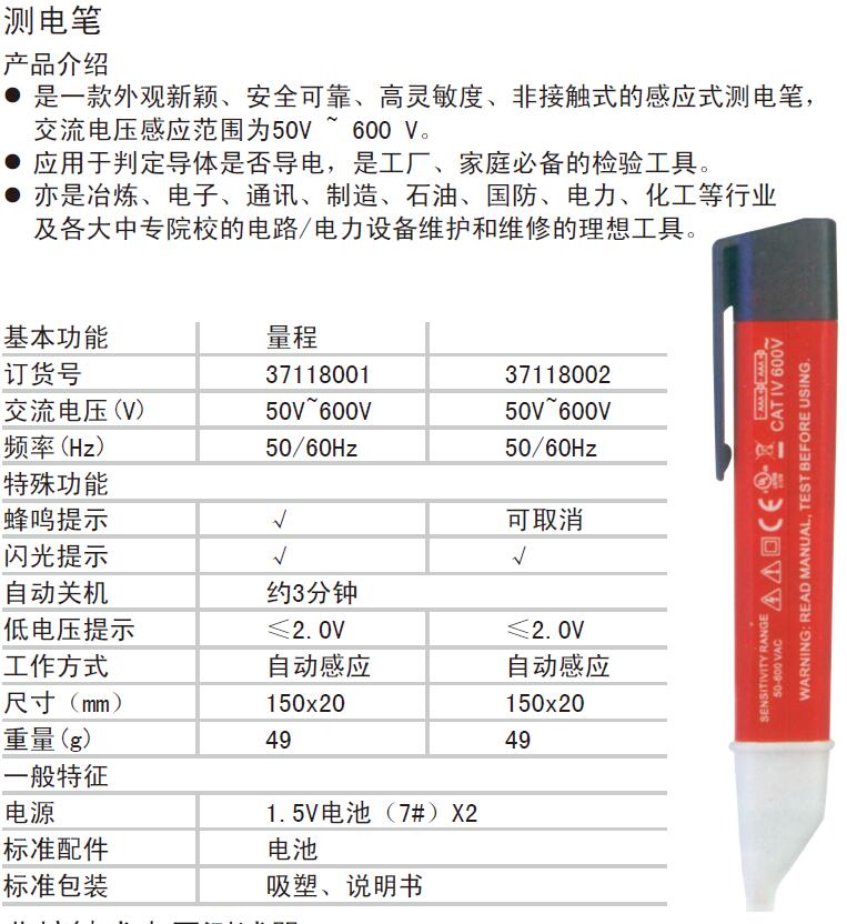 A51675 37118001 50V~600V 0/60Hz 特殊功能量程 约3分钟 ≤2.0V 自动感应 150×20mm 49g 173.25