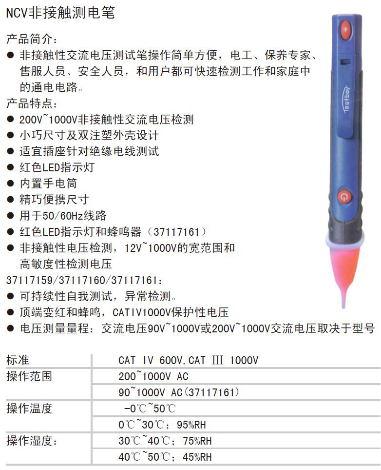 ·产品简介: ·非接触性交流电压测试笔操作简单方便,电工、保养专家、 售服人员、安全人员,和用户都可快速检测工作和家庭中 的通电电路。 ·产品特点: ·200V~1000V非接触性交流电压检测 ·小巧尺寸及双注塑外壳设计 ·适宜插座针对绝缘电线测试 · 红色LED指示灯 ·内置手电筒 ·精巧便携尺寸 · 用于50/60Hz线路 ·红色LED指示灯和蜂鸣器(37117161) · 非接触性电压检测,12V~1000V的宽范围和 高敏度性检测电压 37117159/37117160/37117161: ·可持续性自我测试,异常检测。 ·顶端变红和蜂鸣,CATIV1000V保护性电压 · 电压测量量程:交流电压90V~1000V或200V~1000V交流电压取决于型号