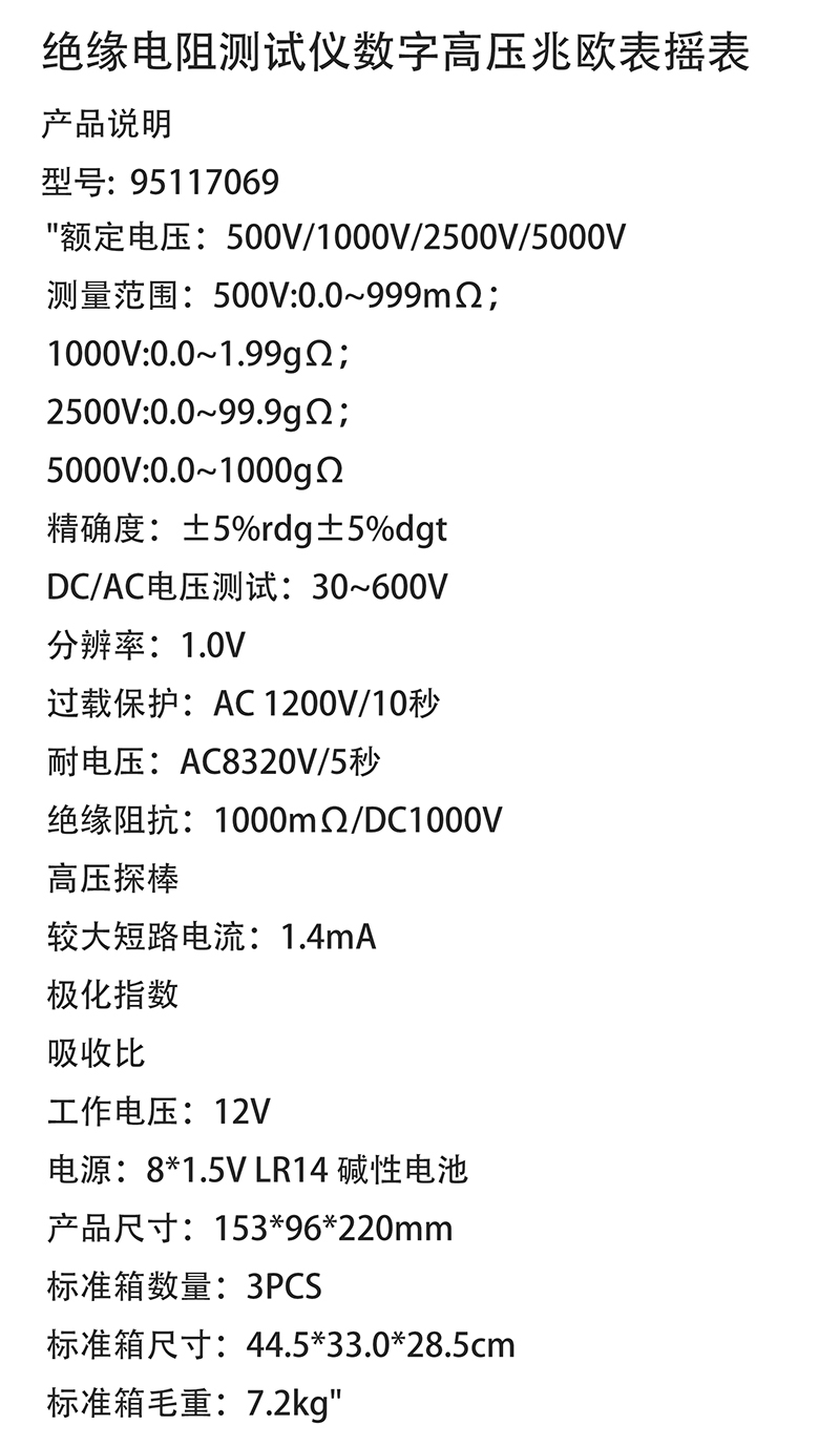 绝缘电阻测试仪 95117069 153×96×220mm 1台