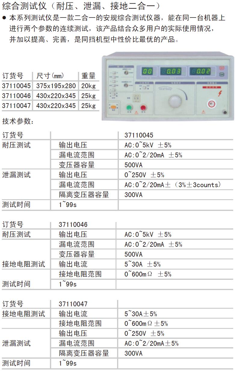 本系列测试仪是一款二合一的安规综合测试仪器,能在同一台机器上 进行两个参数的连续测试,该产品结合众多用户的实际使用情况, 并加以提高、完善,是同挡机型中性价比最优的产品。