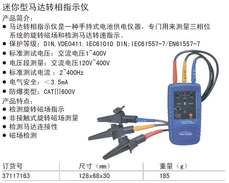 产品简介: · 马达转相指示仪是一种手持式电池供电仪器,专门用来测量三相位 系统的旋转磁场和检测马达转速指示。 · 保护等级:DIN,VDE0411,IEC61010 DIN;IEC61557-7/EN61557-7 · 标准测试电压:交流电压1~400V · 电压段测量:交流电压120V~400V · 标准测试电流 :2~400Hz · 电气安全:<3.5mA · 防爆类型:CATⅢ600V 产品特点: · 检测旋转磁场指示 · 非接触式旋转磁场测量 · 检测马达连接性 · 磁场检测