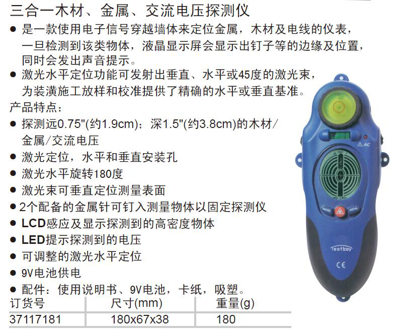 ·是一款使用电子信号穿越墙体来定位金属,木材及电线的仪表, 一旦检测到该类物体,液晶显示屏会显示出钉子等的边缘及位置, 同时会发出声音提示。 · 激光水平定位功能可发射出垂直、水平或45度的激光束, 为装潢施工放样和校准提供了精确的水平或垂直基准。 产品特点: · 探测远0.75"(约1.9cm);深1.5"(约3.8cm)的木材 金属/交流电压 · 激光定位,水平和垂直安装孔 · 激光水平旋转180度 · 激光束可垂直定位测量表面 · 2个配备的金属针可钉入测量物体以固定探测仪 · LCD感应及显示探测到的高密度物体 · LED提示探测到的电压 · 可调整的激光水平定位 · 9V电池供电 ·配件:使用说明书、9V电池,卡纸,吸塑。