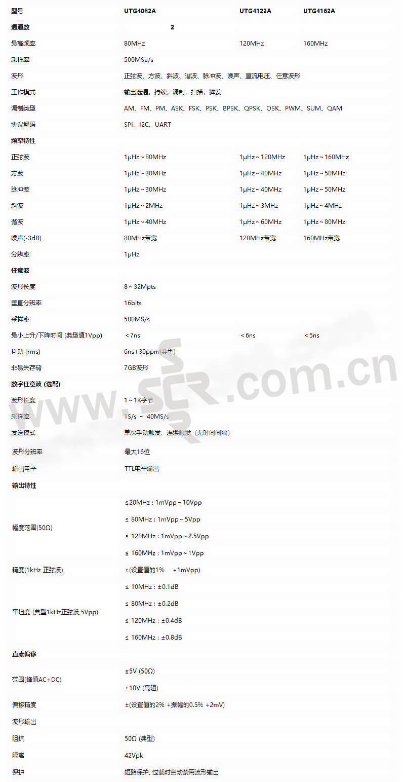 ·160MHz正弦波输出,全频段1μHz的分辨率·50MHz脉冲波形,上升、下降时间可调·500MSa/s采样速度和16bits垂直分辨率·标配等性能双通道,且具有通道独立或通道耦合的输出模式·32Mpts任意波存储器,7GB非易失波形存储·丰富的调制类型:AM、FM、PM、ASK、FSK、PSK、BPSK、QPSK、OSK、PWM、SUM、QAM·8英寸TFT LCD,WVGA(800× 480)·标准配置接口:USB Host、US