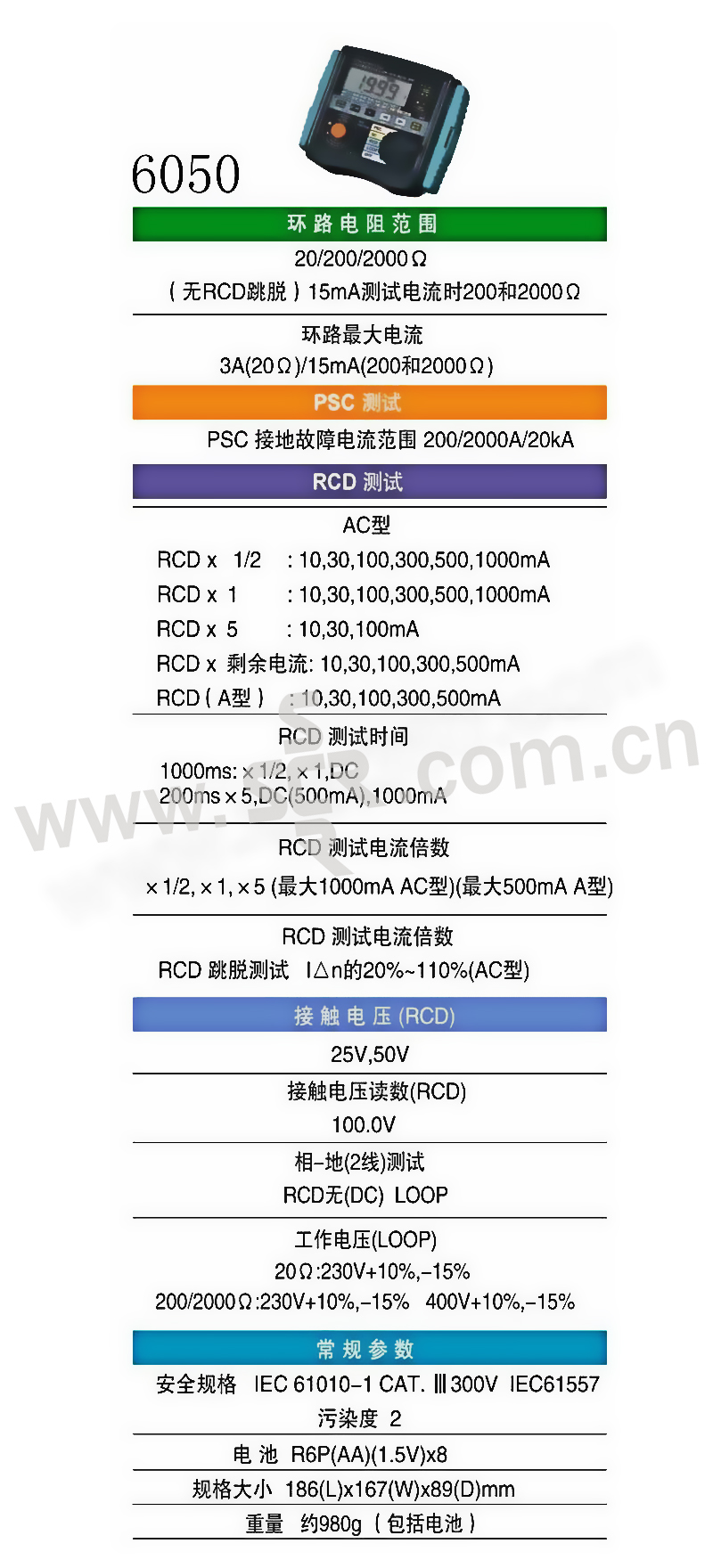·测试的回路电阻和漏电开关值可存储于仪器中。 ·环路电阻20/2000Ω不会使15mA的RCD跳脱。 ·20Ω环路电阻0.01Ω的分辨率。 ·短路电流可以直接读出。 ·RCD测试允许0度到180度相位角测试。 ·故障电流不影响读数。 ·检测接线是否正确。 ·MODEL 6050多功能测试仪的设计符合国际安全规格IEC61010-1,IEC61557及IP54。 ·测试数据可经MODEL8212数据线传输至PC。