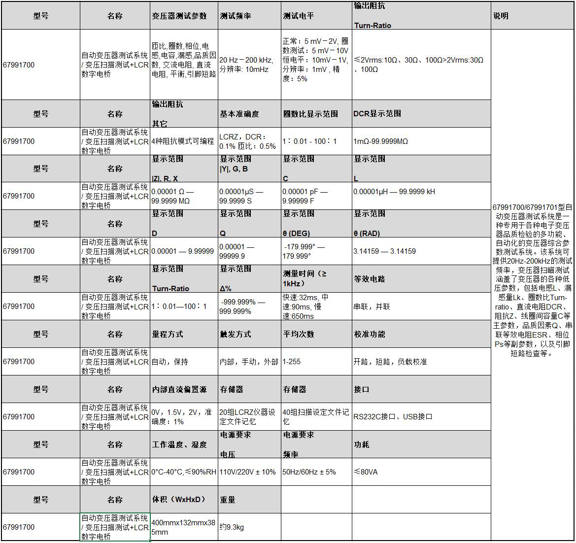 ·专用于各种电子变压器品质检验的多功能、自动化的变压器综合参数测试系统 ·该系统可提供20Hz-200kHz的测试频率,变压器扫瞄测试涵盖了变压器的各种低压参数,包括电感L、漏感量Lk、圈数比Turn-ratio、直流电阻DCR、阻抗Z、线圈间容量C等主参数,品质因素Q、串联等效电阻ESR、相位Ps等副参数,以及引脚短路检查等