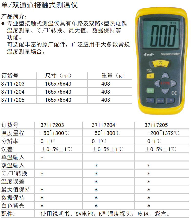 ·产品简介: · 专业型接触式测温仪具有单路及双路K型热电偶 温度测量、℃/℉转换、最大值、数据保持等 功能。 可选配丰富的原厂配件,广泛应用于大多数常规 温度测量场合。