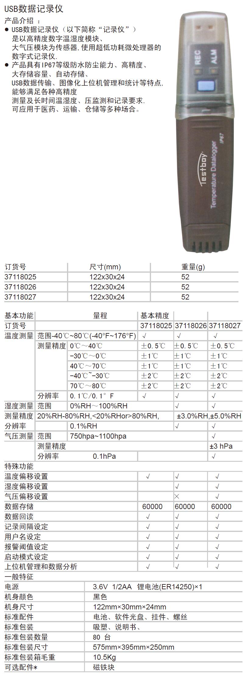A51771 37118025 温度测量,范围-40℃~80℃(-40°F~176°F) √ 0℃~40℃ ±0.5℃ (-30℃~0℃) ±1℃ 40℃~70℃ ±1℃ (-40℃~-30℃) ±2℃ 70℃~80℃ ±2℃ 分辨率,0.1℃/0.1°F √ 0%RH~100%RH 20%RH-80%RH,<20%RHor>80%RH, ±3.0%RH,±5.0%RH 0.1%RH 750hpa~1100hpa 0.1hPa 60000 3.6V1/2AA锂电池(ER14250)×1 黑色 122mm×30mm×24mm 80台 575mm×395mm×250mm 10.5Kg 磁铁块 600.60