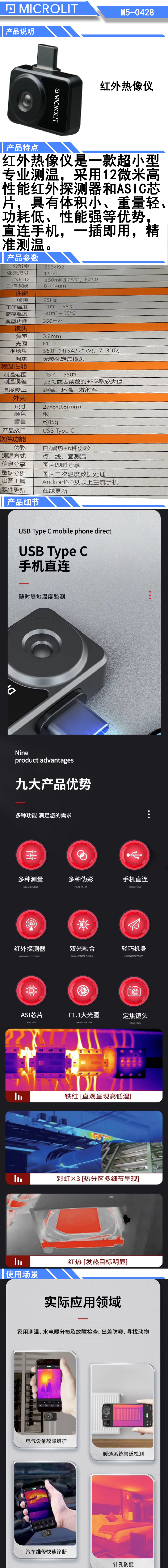 红外热像仪是一款超小型专业测温,采用12微米高性能红外探测器和ASIC芯片,具有体积小、重量轻、功耗低、性能强等优势,直连手机,一插即用,精准测温。