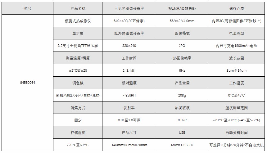 A35312 84550964 -20°℃至300°C (-4°F至572°F) ±2°C或±2% 红外 固定 320×240 3.2英寸全视角TFT显示屏 640×480(30万像素) 56°×42°/4.0mm 0.07C 0.01至1.0可调 9Hz 8um至14um 彩虹/铁红/冷色/白热/黑热 内置3G(可存储图像3万张以上) JPG 内置可充电1800mAh电池 Micro USB 2.0 可选择:5分钟/20分钟/不自动关机 2-3小时 140mm×80mm×28mm 10438.40