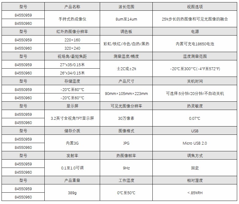 A35308 84550959 -20℃至300°℃(-4°F至572°F) 士2C或±2% 红外 固定 220×160 3.2英寸全视角TFT显示屏 30万像素 27°×35/0.15米 0.07℃ 0.1至1.0可调 9Hz 8um至14um 固定 彩虹/铁红/冷色/白热/黑热 25%步长的热图像和可见光图像的融合 内置3G JPG 内置可充电18650电池 Micro USB 2.0 可选择:5分钟/20分钟/不自动关机 7392.00