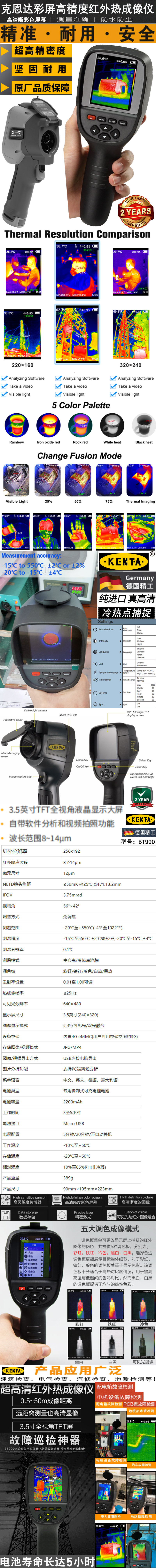 彩屏高精度红外热成像仪 3.5英寸TFT全视角液品显示大屏 自带软件分析和视频拍照功能 波长范围8-14um 红外热图像分辨率:256X192 温度测量范围:零下20度 - +550度(-4F-1022%F)