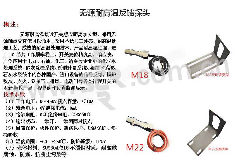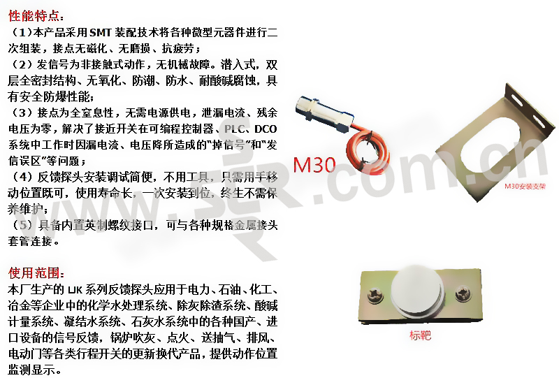 ·本产品采用SMT装配技术将各种微型元器件进行二次组装,接点无磁化、无磨损、抗疲劳;发信号为非接触式动作,无机械故障。潜入式,双层全密封结构、无氧化、防潮、防水、耐酸碱腐蚀,具有安全防爆性能;反馈探头安装调试简便,不用工具,只需用手移动位置既可,使用寿命长,一次安装到位,终生不需保养维护;