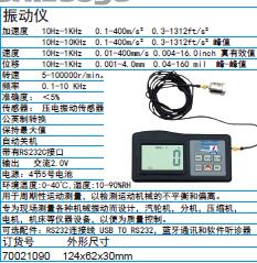 ·加速度0Hz-1KHz0.1-400m/s²0.3-1312ft/s²10Hz-10KHz0.1-400m/s²0.3-1312ft/s²峰值速度10Hz-1KHz0.01-400mm/s0.004-16.0inch真有效值位移10Hz-1KHz0.001-4.0mm0.04-160mil峰-峰值转速5-100000r/min。 ·频率0.1-10KHz准确度:<5%传感器:压电振动传感器公英制转换保持最大值自动关机带有RS232C接口输出交流2.0V电源:4节5号电池环境温度:0-40℃,湿度:10-90%RH用于周期性运动测量,以检测运动机械的不平衡和偏离。 ·专为现场测量各种机械振动而设计,汽轮机,分机,压缩机,电机,机床等仪器设备,以便为质量控制。 ·可选配件:RS232连接线USBTORS232,蓝牙通讯和软件听诊器