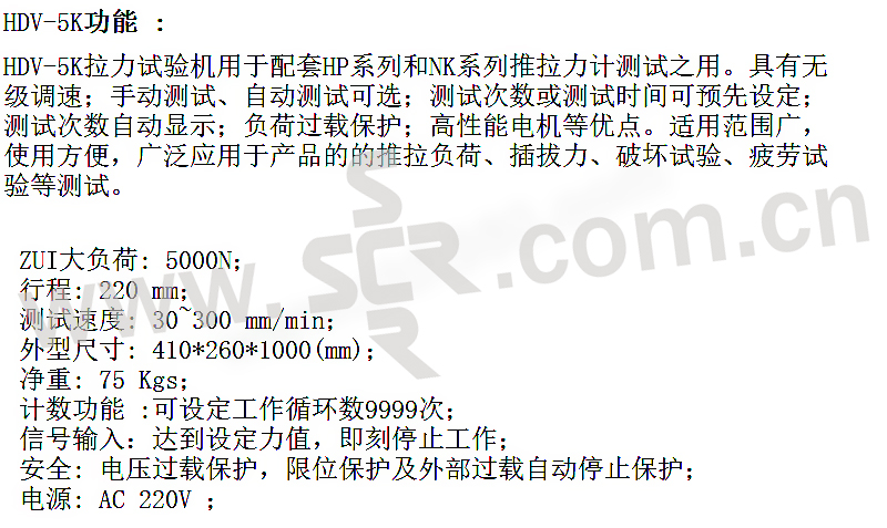 ·HDV-5K拉力试验机专用于配套HP系列和NK系列推拉力计测试之用。具有无级调速;手动测试、自动测试可选;测试次数或测试时间可预先设定;测试次数自动显示;负荷过载保护;高性能电机等优点。适用范围广,使用方便,广泛应用于产品的的推拉负荷、插拔力、破坏试验、疲劳试验等测试。 ·产品参数: ·最大负荷:5000N; ·行程:220mm; ·测试速度:30~300mm/min; ·外型尺寸:410*260*1000(mm); ·净重:75Kgs;