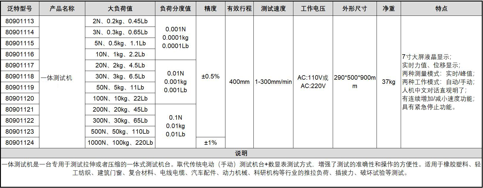 ·7寸大屏液晶显示; ·实时力值、位移显示; ·两种测量模式:实时/峰值; ·两种工作模式:自动/手动; ·人机中文对话直观明了; ·有连续增加/减小速度功能; ·具有紧急停止功能。