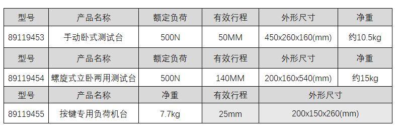 ·产品特征: ·功能:按键用负荷测试台用按键测力计配备,用于按键按钮的按压力负荷测试,具有高精度、易操作、快速复位等优点。本机台使用方便,可安放在各种工作台面上使用