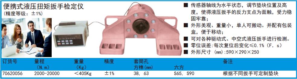 ·传感器轴线为水平状态,调节垫块位置及高度,使得液压扳手的反力支点为面触,受力稳固牢靠; ·外形美观、重量小,单人可搬动。并配有包装盒,便于移动; ·可对各种驱动式、中空式液压扳手进行检测。 ·零位误差:每次复位后变化≤0.1%(F.s) ·外形尺寸(mm):590×290×250