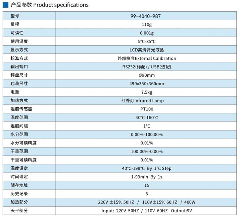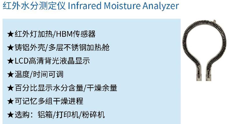 ·红外灯加热/HBM传感器 ·铸铝外壳/多层不锈钢加热舱 ·LCD高清背光液晶显示 ·温度/时间可调 ·百分比显示水分含量/干燥余量 ·可记忆多组干燥进程 ·选购:铝箱/打印机/粉碎机