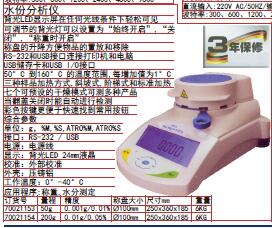 ·背光LED显示屏在任何光线条件下轻松可见 ·可调节的背光灯可以设置为“始终开启”,“关闭”,“称重时开启” ·称盘的升降方便物品的置放和移除 ·RS-232和USB接口连接打印机和电脑 ·USB储存卡和USBI/O接口 ·50°C到160°C的温度范围,每增加值为1°C ·三种样品加热方式,斜坡式,阶梯式和标准加热 ·七个可预设的干燥模式可测多种产品 ·当翻盖关闭时能自动进行检测 ·彩色按键更便于快速找到常用按钮 ·综合参数 ·单位:g,%M,%S,ATRO%M,ATRO%S ·接口:RS-232/USB ·电源:电源线 ·显示:背光LED24mm液晶 ·校准:外部校准 ·外壳:压铸铝 ·工作温度:0°-40°C ·应用程序:称重,水分测定