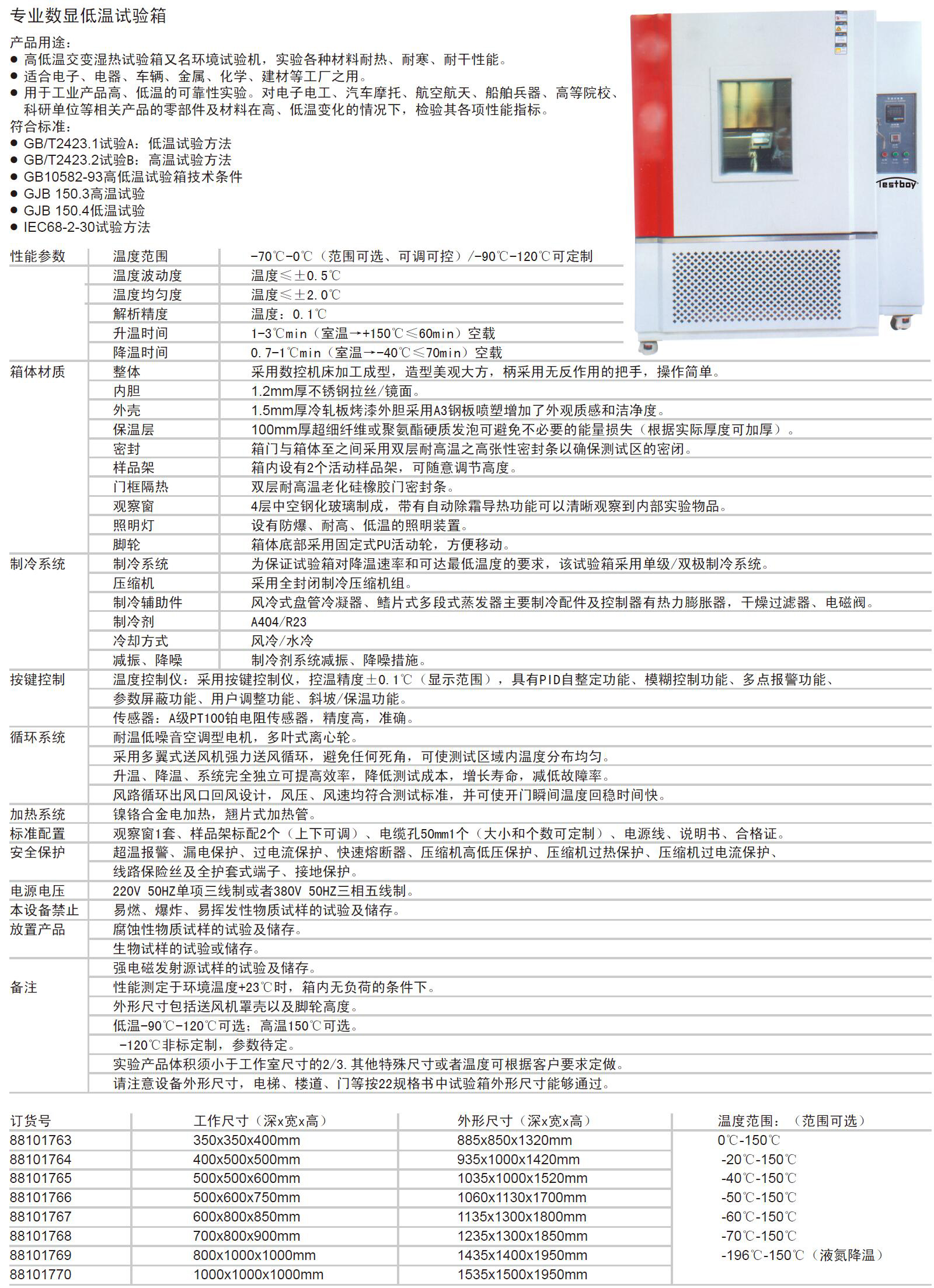温度范围 -80-+130℃(-90~-120范围可选) -80℃、-90℃、-100℃、-110℃、-120℃ 温度波动度 ≤±0.5℃ 温度均匀度 ≤2.0℃ 温度偏差 ≤±2.0℃ ·升温时间 -80℃→+130℃≤80min空载 ·降温时间 +20℃→-800℃≤80min空载 ·箱体材质 内胆 1.5mm厚不锈钢 ·外壳 1.5mm冷轧板烤漆 ·保温层 -80℃-0℃(100mm厚聚氨酯) -80℃~-120℃(150mm厚聚氨酯) ·制冷系统 制冷系统 机械压缩式复叠/并联机组制冷系统(风冷/水冷) ·压缩机 全封闭压缩机 ·制冷剂 混合药水 ·冷却方式 风冷/水冷 ·控制器 温度控制器 解析精度±0.1℃。 ·8.0"真彩触摸屏/中文或英文输入/历史曲线··记录/PID自整定/编程循环。 ·温度传感器:铂电阻PT100。 ·加热系统 镍铬合金电加热,翘片式加热管。 ·标准配置 观察窗1套、样品架标配2个(上下可调)、电缆孔50mm1个(大小和个数可定制)、电源线、说明书、合格证。 ·安全保护 漏电、短路、超温、电机过热、··压缩机超压、过载。过电流保护。 ·电源电压 380V 50HZ三相五线制。 ·本设备禁止 易燃、爆炸、易挥发性物质试样的试验及储存。 ·放置产品 腐蚀性物质试样的试验及储存。 ·生物试样的试验或储存。 ·强电磁发射源试样的试验及储存。 备注 性能测定于环境温度+23℃时,箱内无负荷的条件下。 ·外形尺寸包括送风机罩壳以及脚轮高度。 ·低温-90℃-120℃可选;高温150℃可选。 -120℃非标定制,参数待定。 实验产品体积须小于工作室尺寸的2/3.其他特殊尺寸或者温度可根据客户要求定做。 请注意设备外形尺寸,电梯、楼道、门等按22规格书中试验箱外形尺寸能够通过