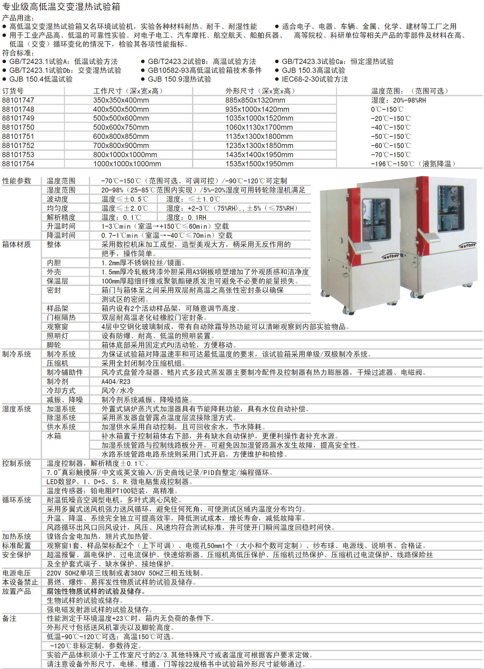 A51851 88101750 220V 50HZ单项三线制或者380V 50HZ三相五线制。 -70℃-150℃(范围可选、可调可控)/-90℃-120℃可定制 温度≤±2.0℃/温度≤±0.5℃ -40℃-150℃ 湿度:≤±1.0℃ 500×600×750mm 1060×1130×1700mm 124859.00